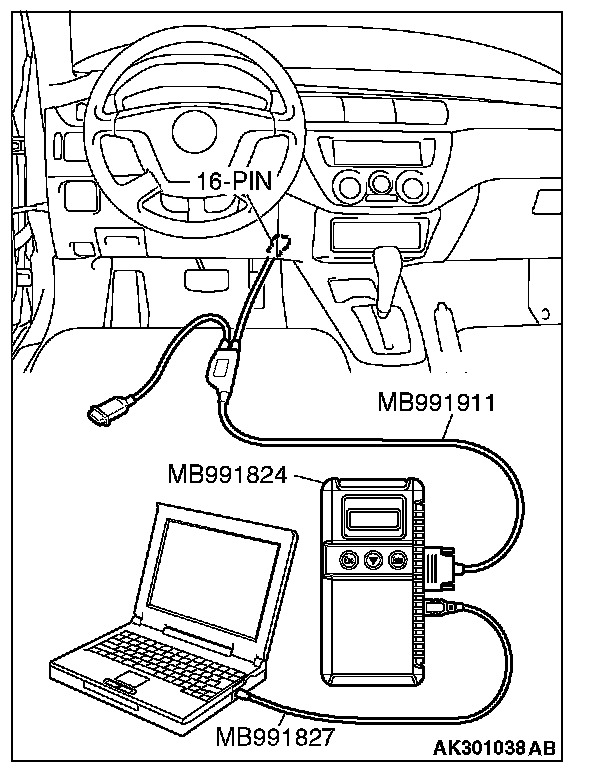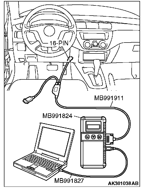CAUTION: To prevent damage to scan tool MB991958, always turn the ignition switch to the "LOCK" (OFF) position before connecting or disconnecting scan tool MB991958.