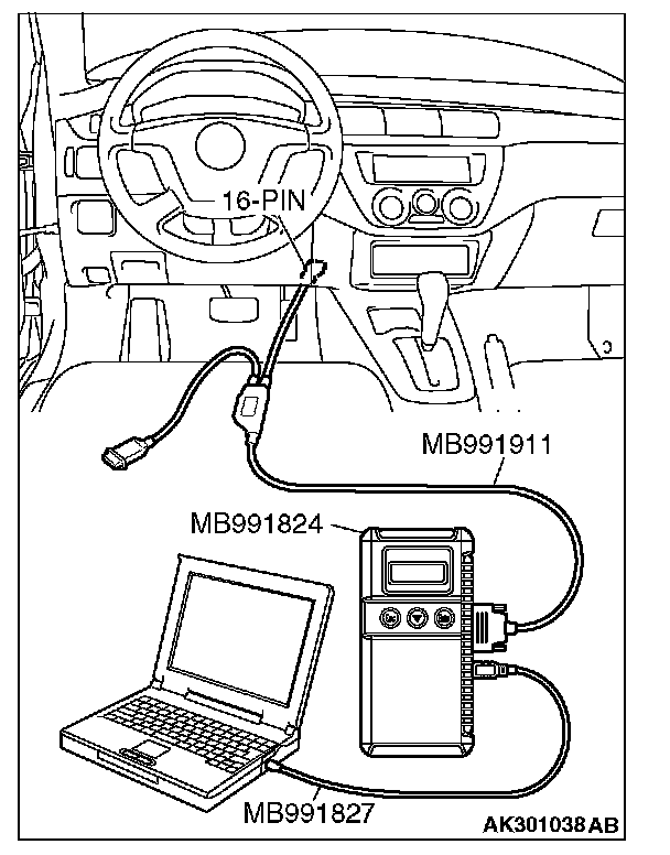 CAUTION: To prevent damage to scan tool MB991958, always turn the ignition switch to the "LOCK" (OFF) position before connecting or disconnecting scan tool MB991958.