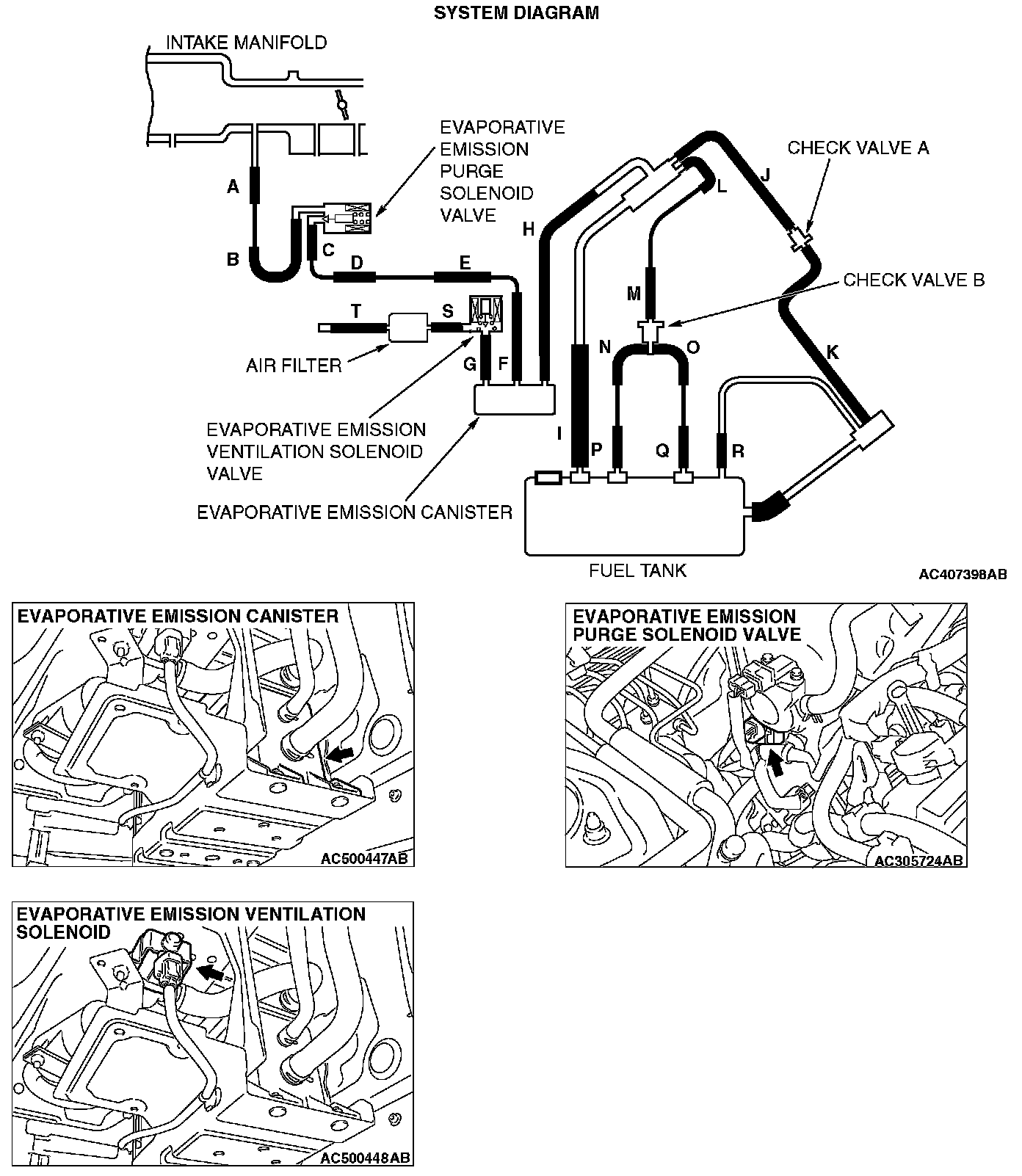 STEP 3. Check for leaks in evaporative emission system hoses A through D.