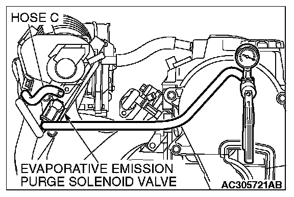 1. Disconnect hose C from the evaporative emission purge solenoid and connect a hand vacuum pump to the nipple of the evaporative emission purge solenoid.