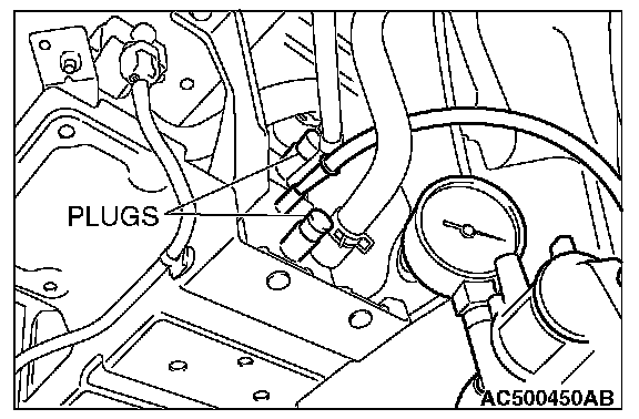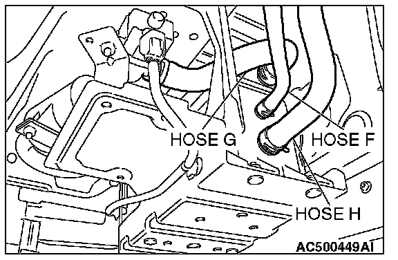 1. Disconnect hoses F, G and H from the evaporative emission canister side, and connect a hand vacuum pump to the evaporative emission canister instead of hose F, and plug the other nipples.