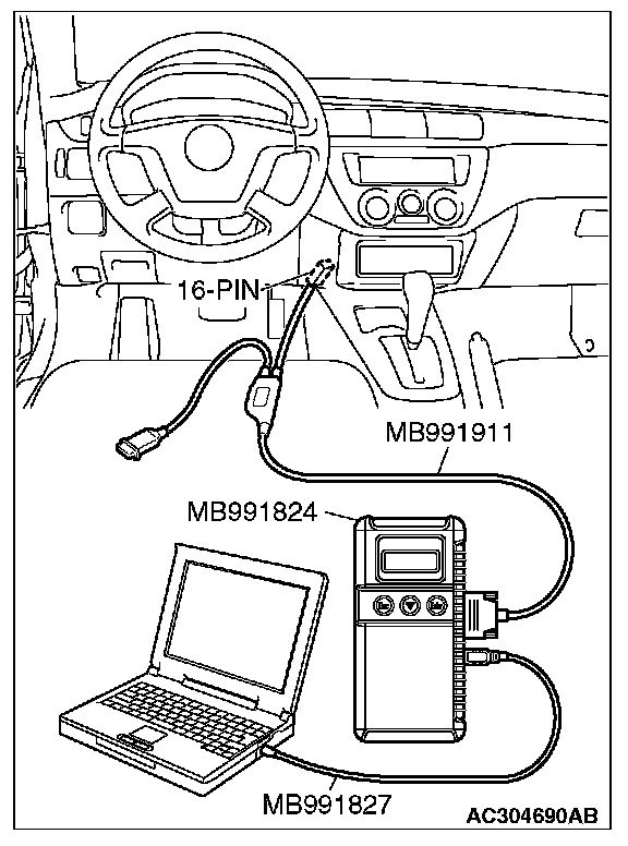 CAUTION: To prevent damage to scan tool MB991958, always turn the ignition switch to the "LOCK" (OFF) position before connecting or disconnecting scan tool MB991958.