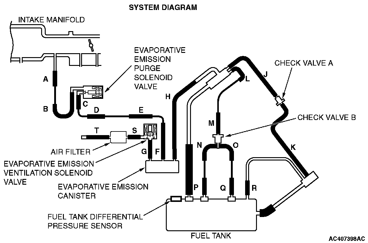 - To check for system blockage, do a performance test which uses a mechanical vacuum gauge and scan tool MB991958 set on the fuel tank differential pressure sensor (TANK PRS SNSR 73). The mechanical gauge reading is used to verify scan tool MB991958 reading. A comparison of the mechanical gauge with the reading on scan tool MB991958 will locate a problem in the system.
