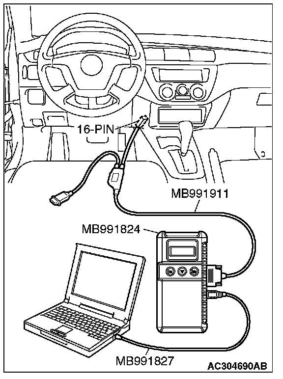CAUTION: To prevent damage to scan tool MB991958, always turn the ignition switch to the "LOCK" (OFF) position before connecting or disconnecting scan tool MB991958.