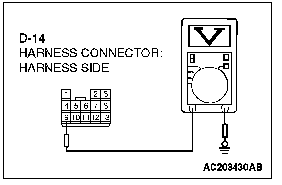 3. Measure the voltage between connector D-14 terminal 9 and ground.