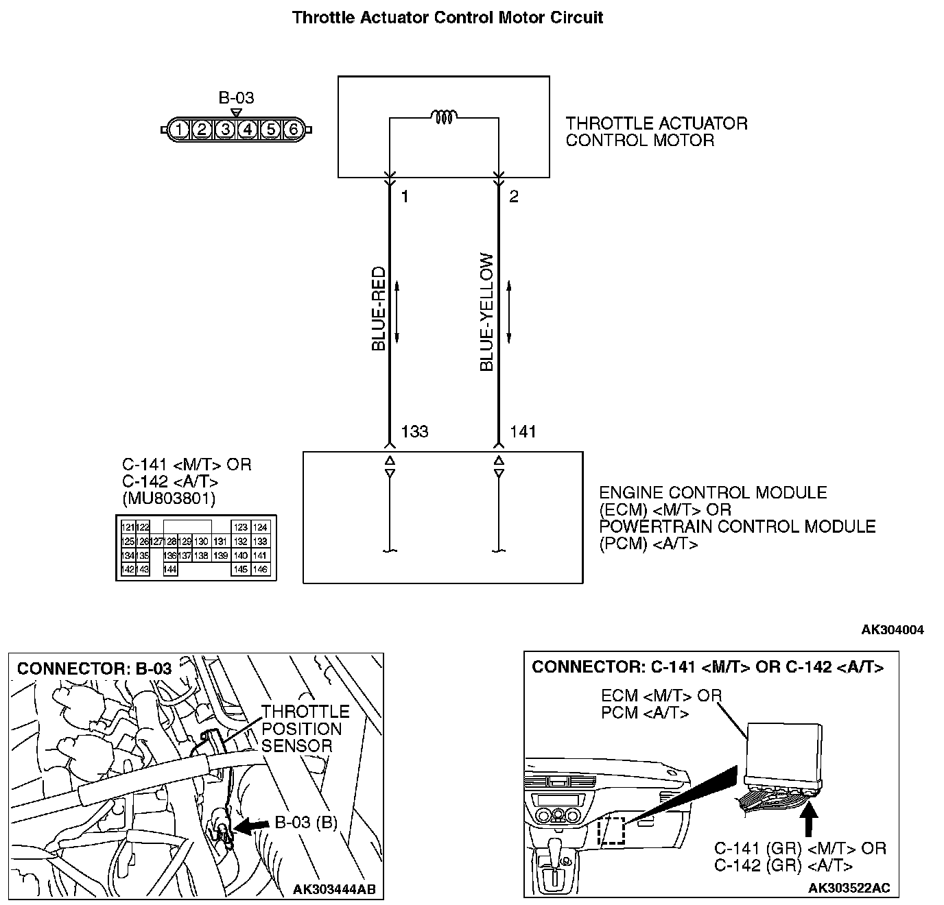 STEP 4. Check for short circuit to ground between throttle actuator control motor connector B-03 (terminal No. 1) and ECM connector C-141