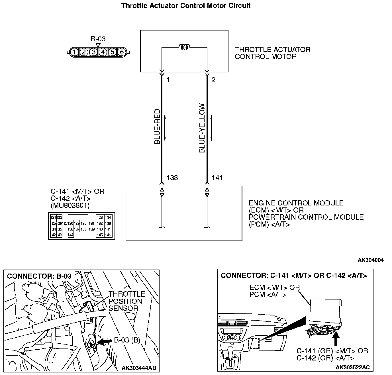 STEP 4. Check for short circuit to ground between throttle actuator control motor connector B-03 (terminal No. 1) and ECM connector C-141