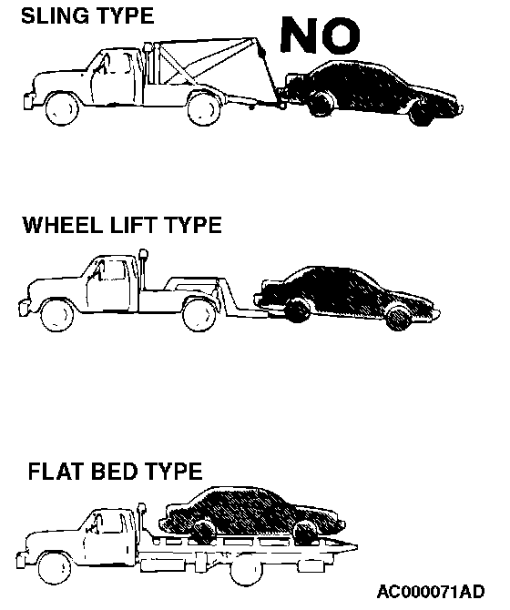 CAUTION: This vehicle cannot be towed by a wrecker using sling-type equipment; otherwise the bumper may become deformed. If this vehicle is towed, use wheel lift or flat bed equipment.