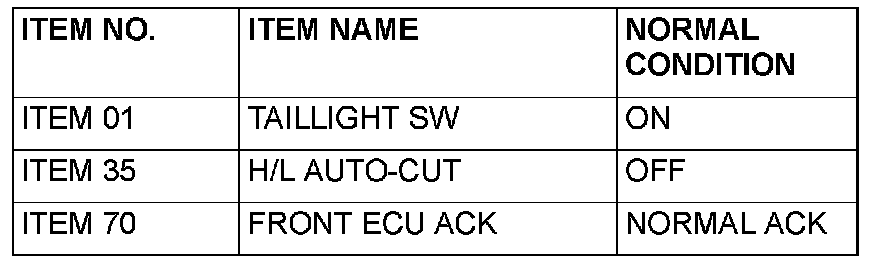 The scan tool does not show the respective normal condition for item "H/L AUTO-CUT" : Refer to Inspection Procedure I-9 "The headlight automatic shutdown function does not work normally."