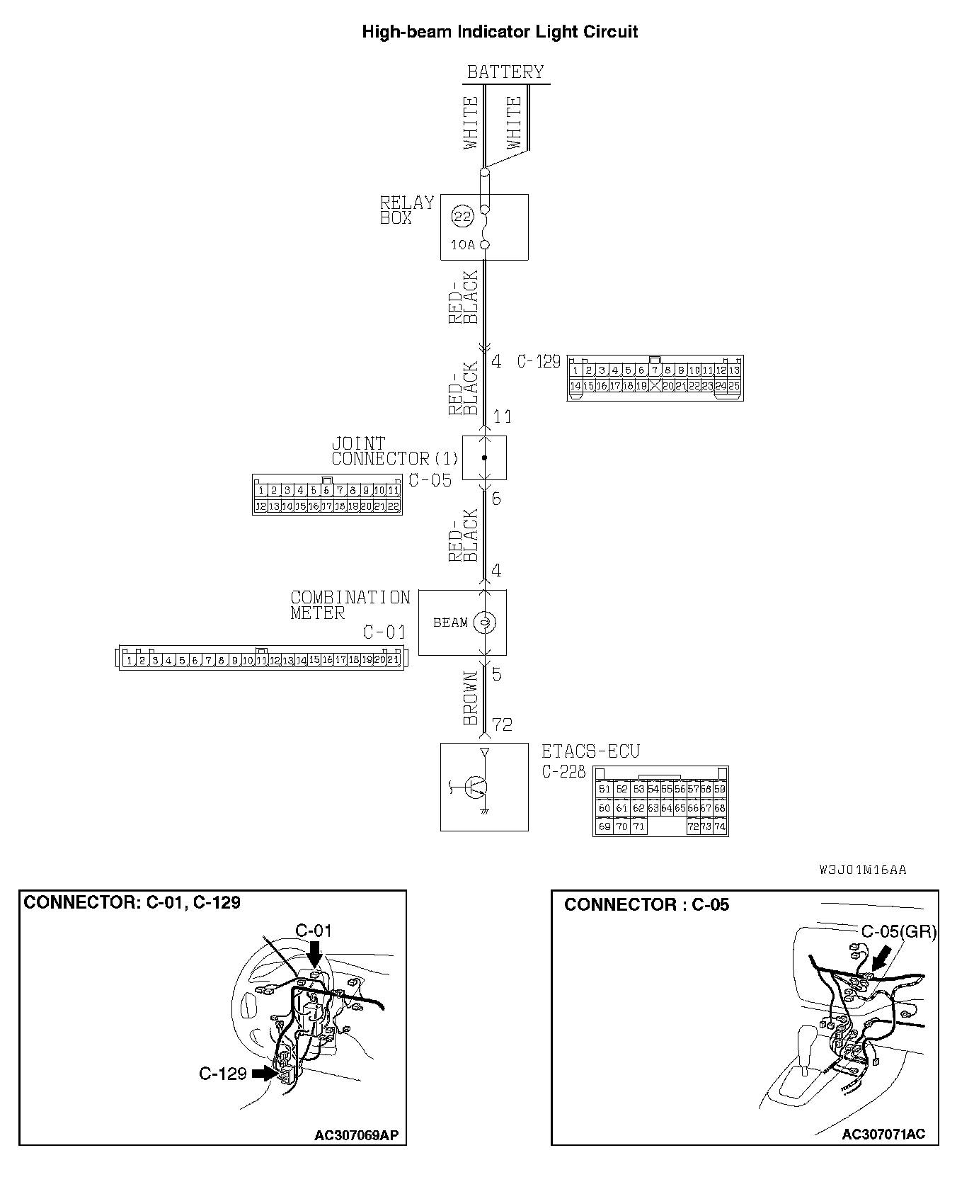 If the high-beam indicator light does not illuminate, the high-beam indicator light bulb or the ETACS-ECU may be defective.