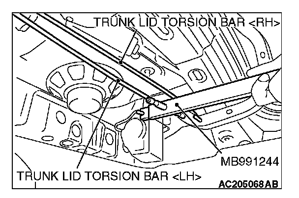 1. Attach the special tool MB991244 to the illustrated portion of the trunk lid torsion bar [LH] on the right hand of the vehicle, then use the tool to detach the trunk lid torsion bar [LH] from the trunk lid hinge [RH]