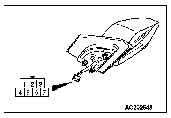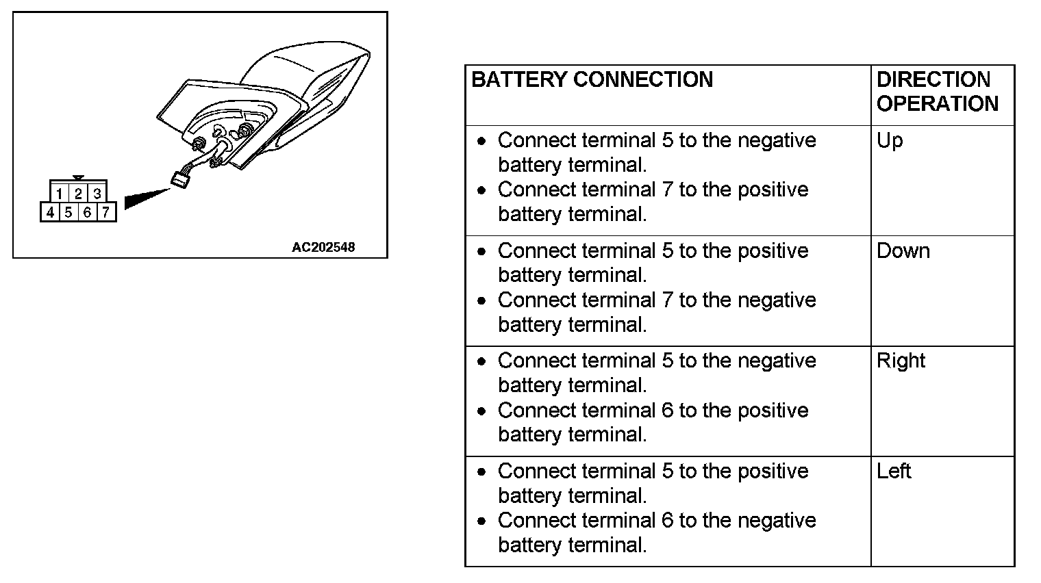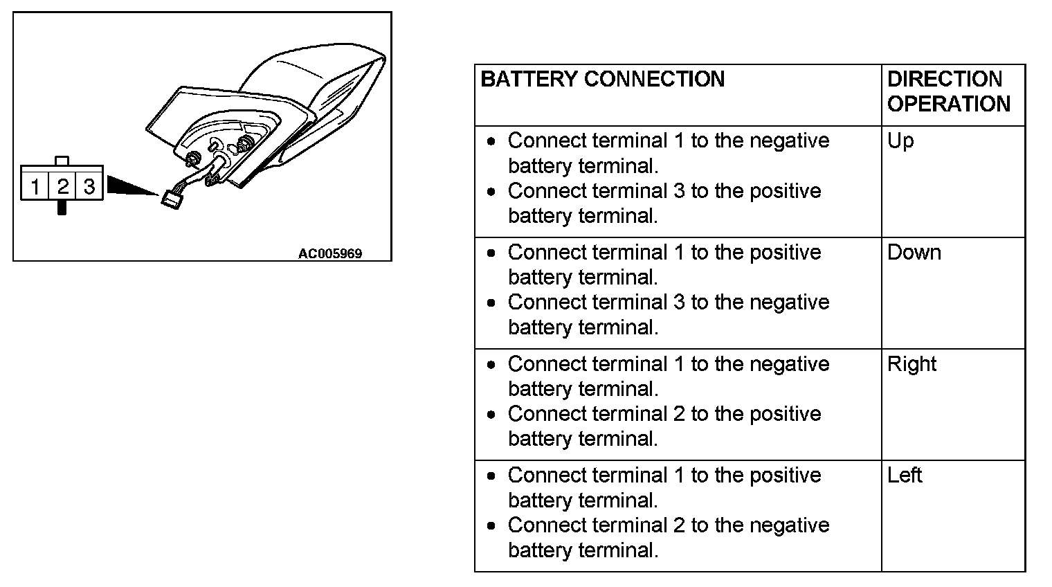 Check that the mirror moves as described in the table when each terminal is connected to the battery.
