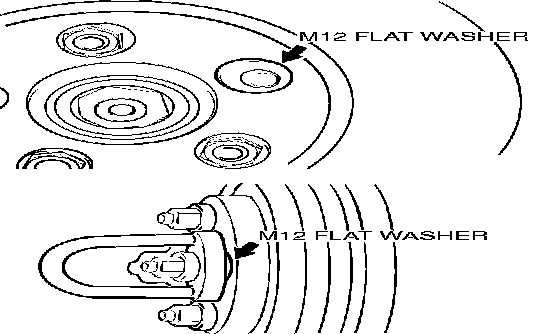 ^ When the on-the-car type lathe is used, first install M12 flat washer on the stud bolt in the brake disc side according to the figure, and then install the adapter. If the adapter is installed with M12 flat washer not seated, the brake disc rotor may be deformed, resulting in inaccurate grinding.