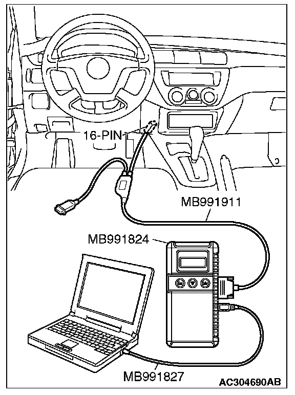 CAUTION: To prevent damage to scan tool MB991958, always turn the ignition switch to the "LOCK" (OFF) position before connecting or disconnecting scan tool MB991958.