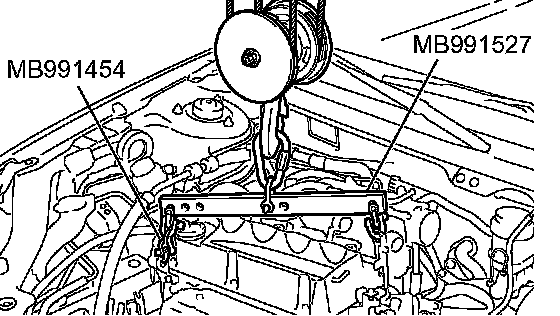 After checking that all cables, hoses and wiring harness connectors and so on are disconnected from the engine, lift the chain block slowly to remove the engine assembly upward from the engine compartment.