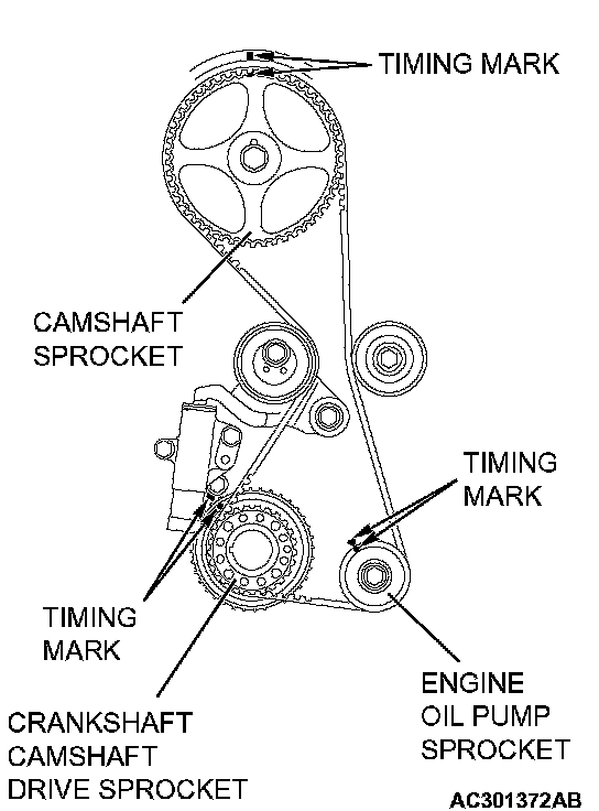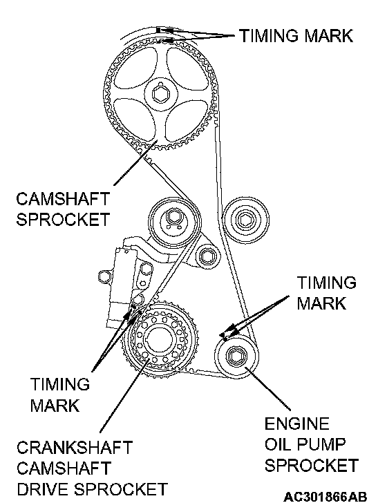 1. Align the timing marks on the camshaft sprocket, crankshaft camshaft drive sprocket and engine oil pump sprocket.