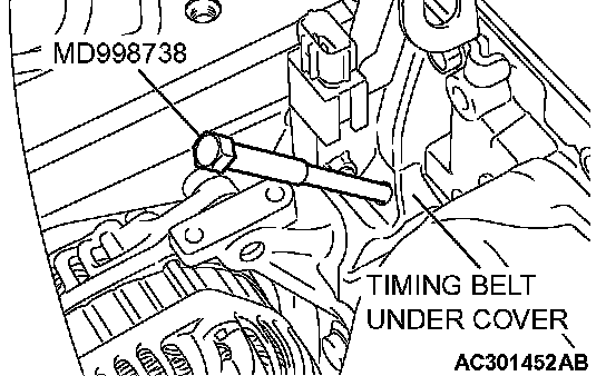 CAUTION: Special tool MD998738 can be gradually installed at a rate of a 30 degree turn per second. If it is screwed in all at once, the timing belt tensioner adjuster rod will not easily retract and special tool MD998738 may bend.