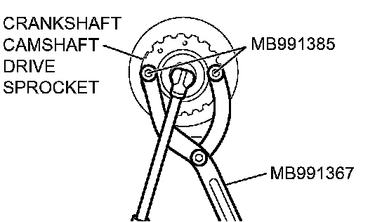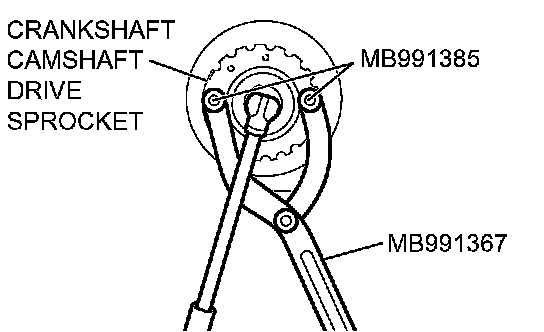 1. Hold the crankshaft camshaft drive sprocket with special tools MB991367 and MB991385.