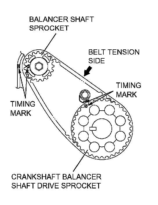 2. Install the balancer timing belt on the crankshaft balancer shaft drive sprocket and balancer shaft sprocket. There should be no slack on the tension side.