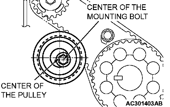 CAUTION: When tightening the mounting bolt, ensure that the timing belt tensioner pulley does not rotate with the bolt. Allowing it to rotate with the bolt can cause deficient tension of the belt.