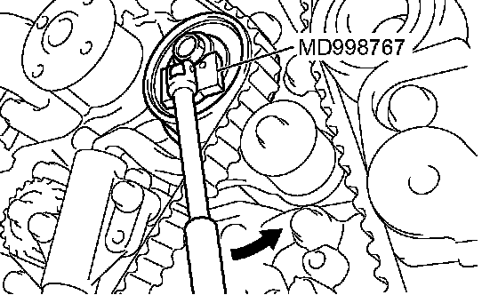 4. Turn the timing belt tensioner pulley in the direction shown in the figure using special tool MD998767 to apply tension to the valve timing belt. Then temporarily tighten and fix the timing belt tensioner pulley mounting bolt.