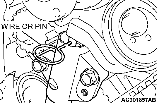 10. Insert wire or pin removed in Step 7 again, and ensure that it can be pulled out with a light load. When wire or pin can be lightly removed, appropriate tension is applied on timing belt. In this case, remove wire or pin.