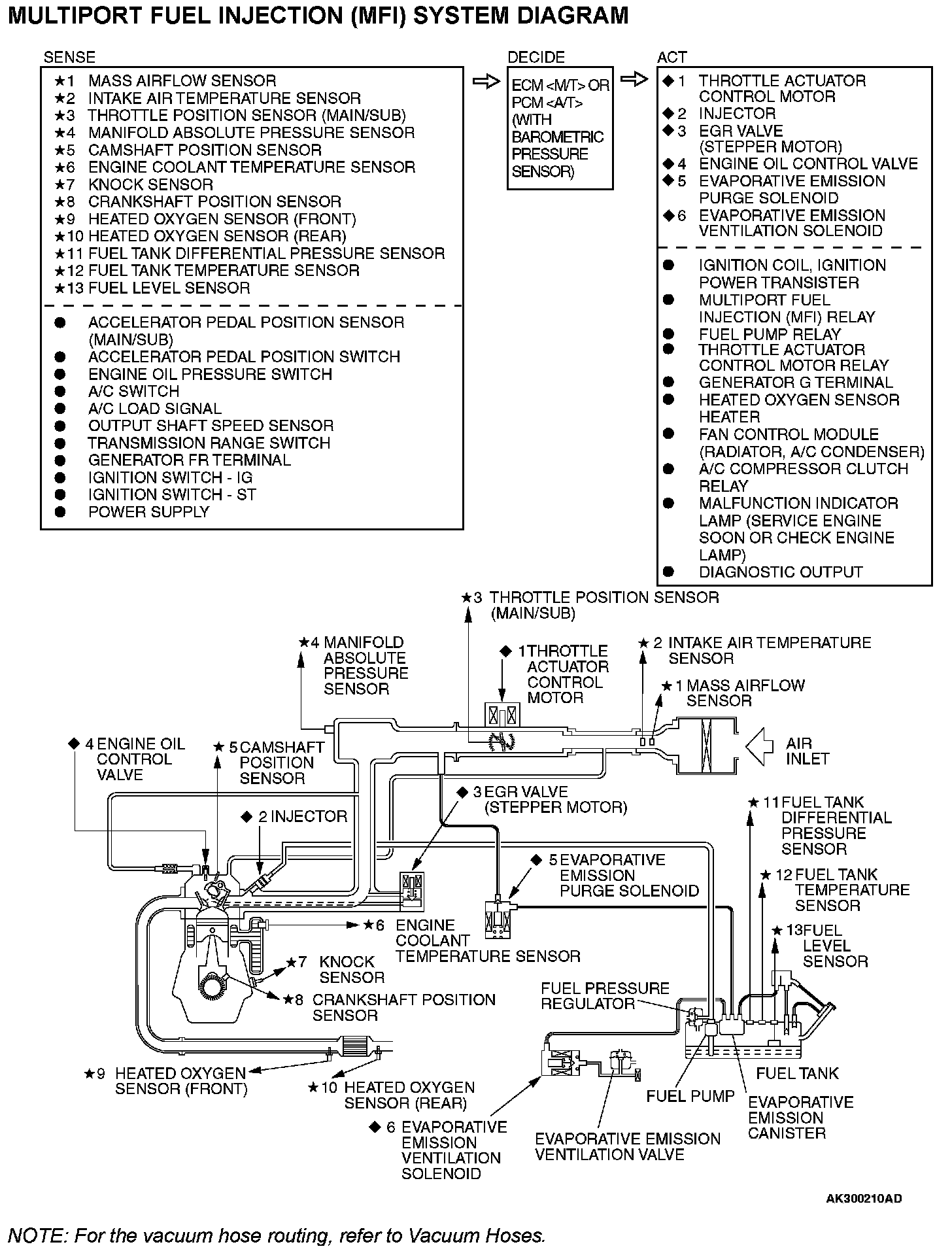 The Multiport Fuel Injection System consists of sensors, actuators and the engine control module (ECM) or powertrain control module (PCM) . The sensors detect the engine condition. The ECM or the PCM controls the system based on signals from these sensors. The actuators work under the control of the ECM or the PCM . The ECM or the PCM carries out activities such as fuel injection control, throttle valve opening control, idle air control, and ignition timing control. In addition, the ECM or the PCM has several diagnostic test modes which simplify troubleshooting when a problem develops.