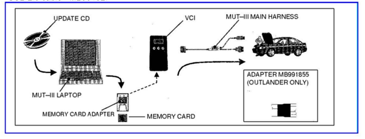 Connect this equipment in the same manner as for normal vehicle diagnosis. When reprogramming a CAN-Flash vehicle, the VCI and MUT-III laptop must be connected. DO NOT use VCI Standalone on CAN-Flash vehicles.
