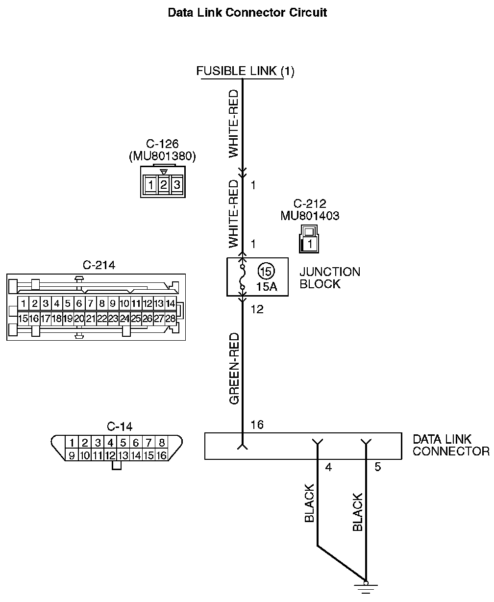 NO: Check harness connectors C-126, C-212 and C-214 at intermediate connector for damage, and repair or replace as required. If intermediate connectors are in good condition, repair harness wire between fusible link (1) and data link connector C-14 (terminal No. 16) because of open circuit. Then confirm that the malfunction symptom is eliminated.