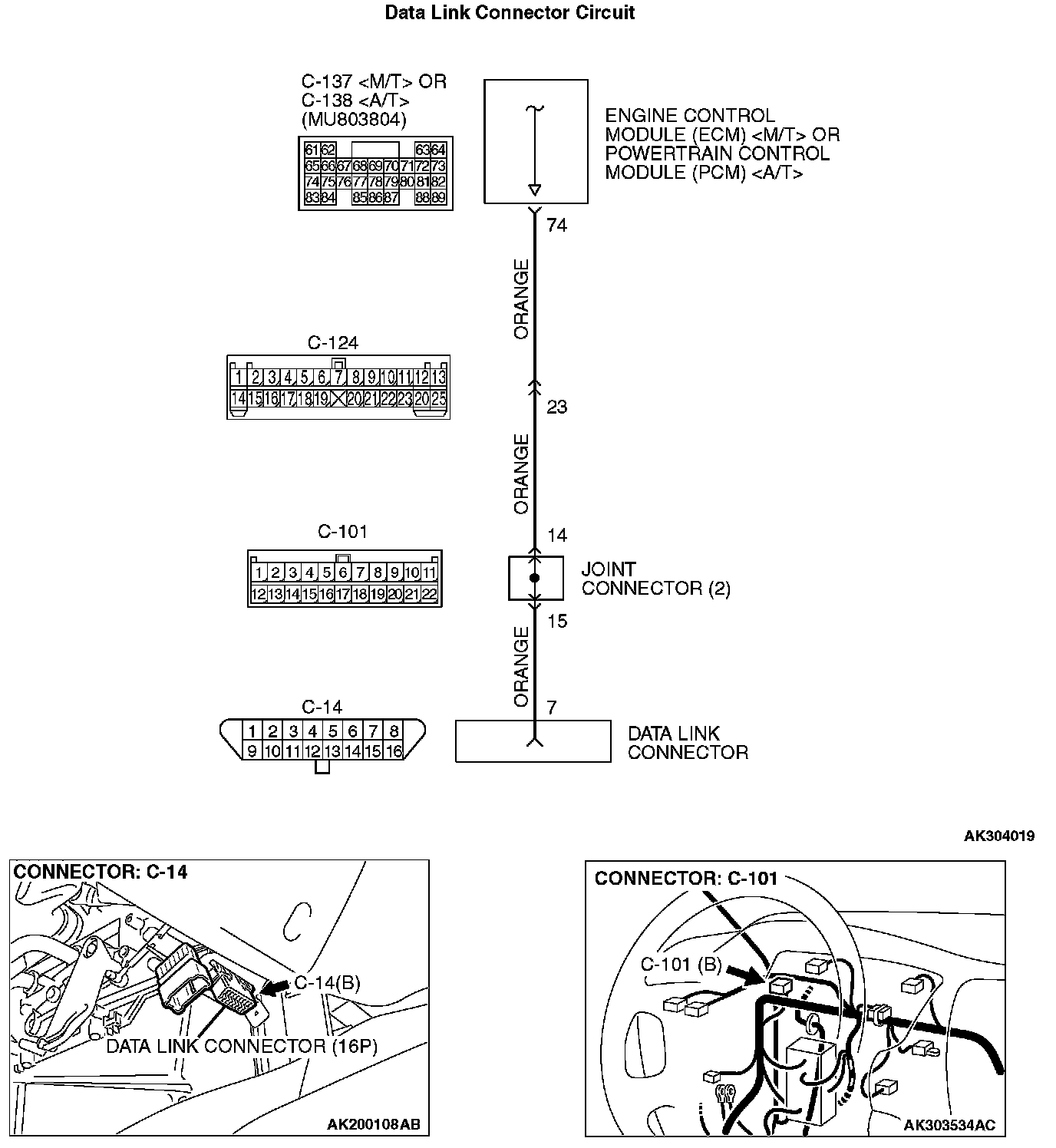 STEP 2. Check for open circuit, short circuit to ground and harness damage between data link connector C-14 (terminal No. 7) and ECM connector C-137