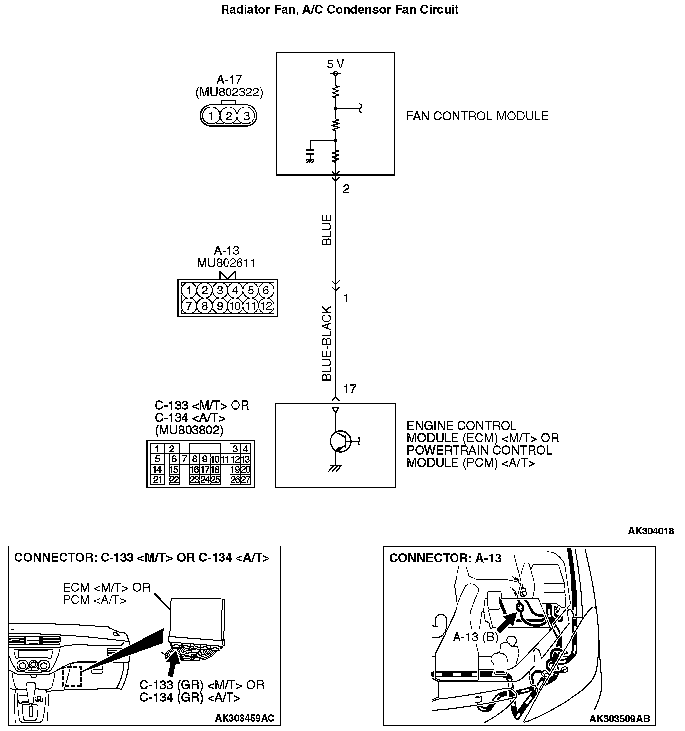 STEP 3. Check for open circuit and short circuit to ground and harness damage between fan control module A-17 (terminal No. 2) and ECM connector C-133
