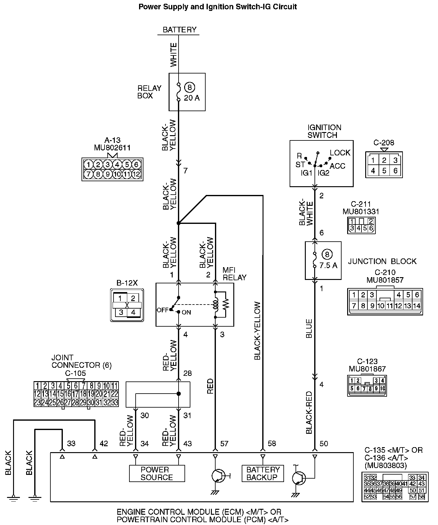 NO: Check harness connector C-123, C-210 and C-211 at intermediate connector for damage, and repair or replace as required. If intermediate connectors are in good condition, repair harness wire between ignition switch connector C-208 (terminal No. 2) and ECM connector C-135