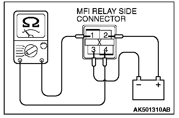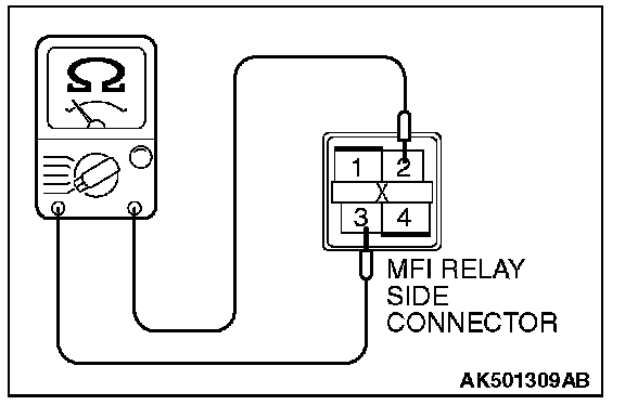 2. Check for continuity between the MFI relay terminal No. 2 and No. 3.