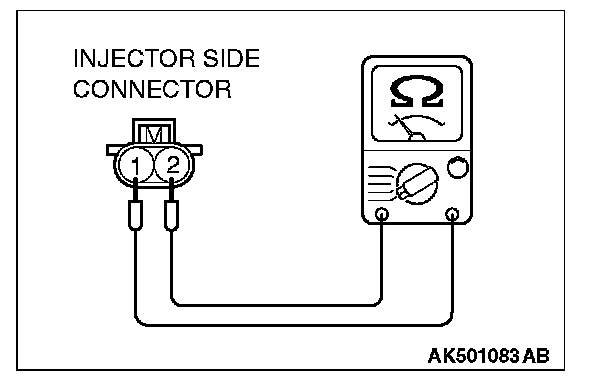 2. Measure the resistance between each injector side connector terminal No. 1 and No. 2.