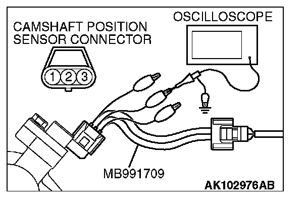 1. Disconnect the camshaft position sensor connector and connect the test harness special tool (MB991709) between the separated connector. (All terminals should be connected.)