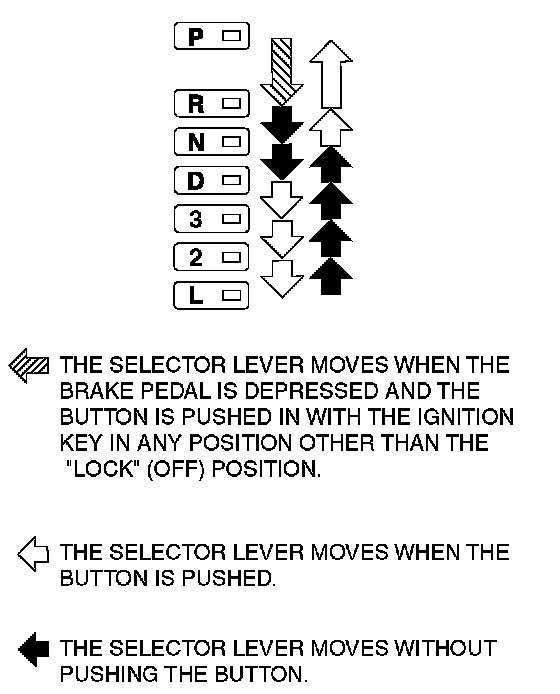 NOTE: The A/T mix-operation prevention mechanism prevents movement of the selector lever from the "P" position if the ignition switch is in a position other than "LOCK" (OFF) and the brake pedal is not depressed.