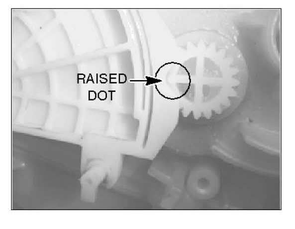 The raised dot on the gear for the door track must be aligned with the notch in the door lever to achieve proper timing. If the link and lever are not installed properly, binding will result.