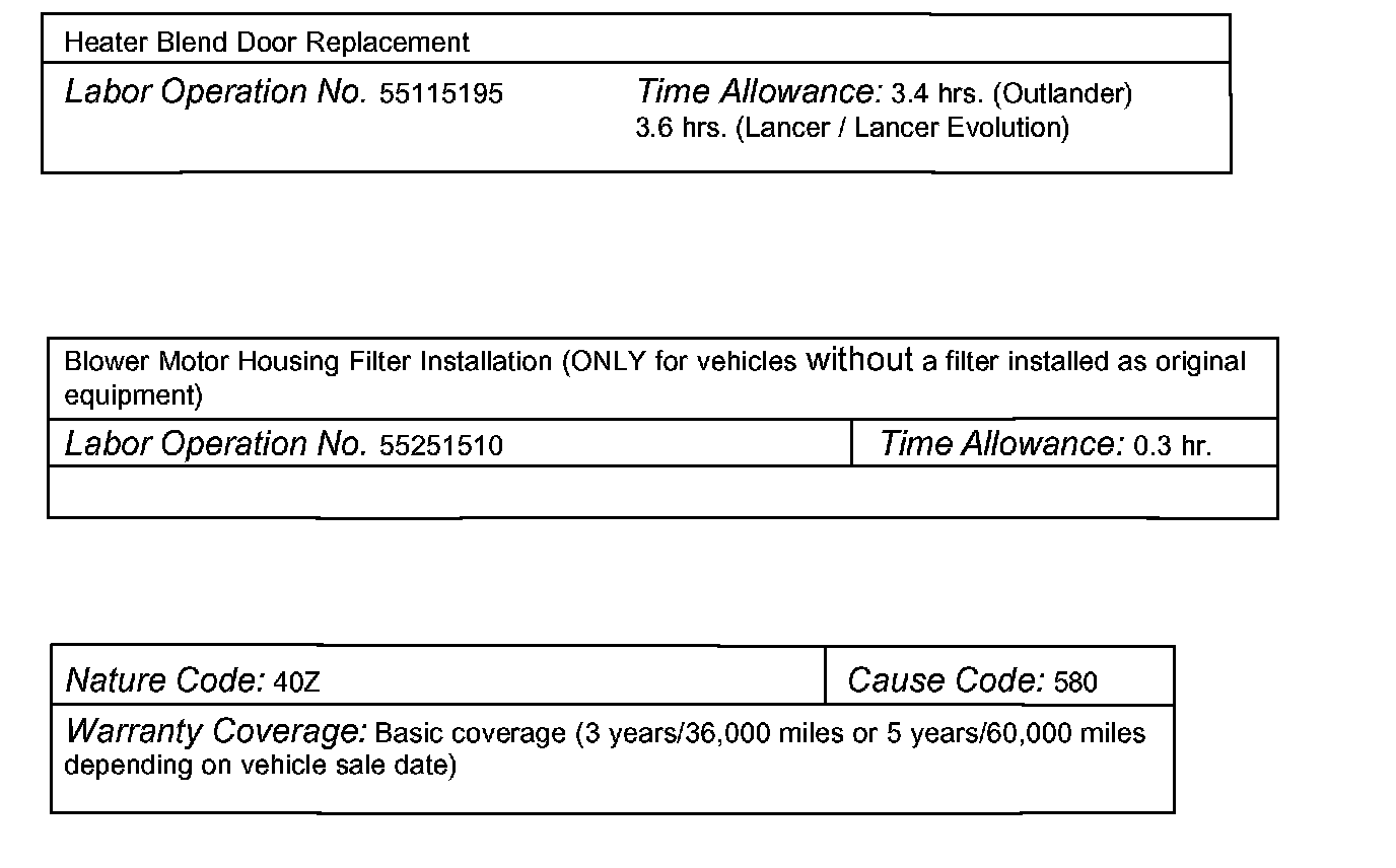 Special Warranty Information: On vehicles that do not have a blower motor housing filter already installed as original equipment, the filter installation described in this TSB should only be done on a customer complaint basis and may be claimed as part of this HVAC system warranty repair. However, future replacements of these installed filters are considered a customer maintenance expense just like any other vehicle filter (oil, air, fuel, etc.).