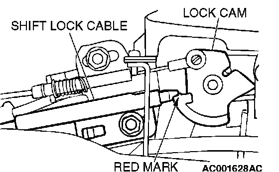 2. Fasten the shift lock cable at the position where the end of the shift lock cable is positioned above the red marking on the lock cam.