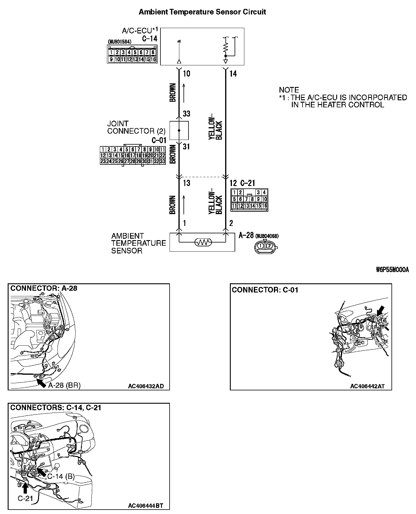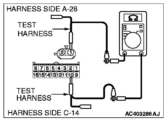 1. Disconnect A/C-ECU connector C-14 and ambient air temperature sensor connector A-28, and measure the resistance at the wiring harness side.