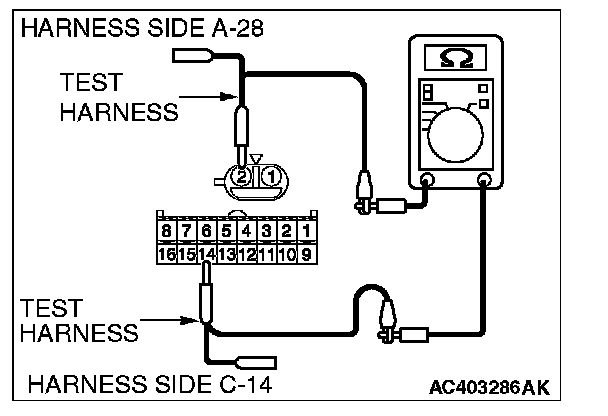 STEP 7. Check the wiring harness between A/C-ECU connector C-14 (terminal 14) and ambient air temperature sensor connector A-28 (terminal 2).