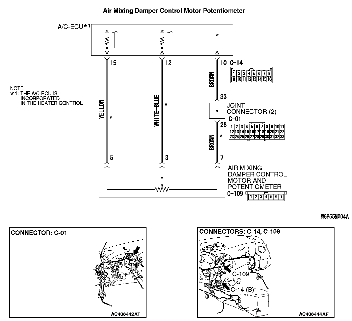 1. Disconnect A/C-ECU connector C-14 and air mixing damper control motor and potentiometer connector C-109, and measure the resistance at the wiring harness side.