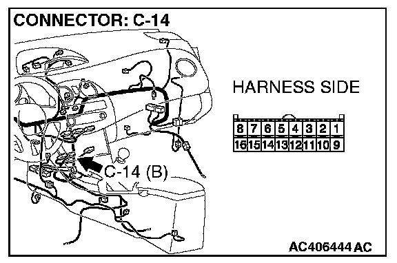 1. Disconnect A/C-ECU connector C-14, and measure the voltage at the wiring harness side.