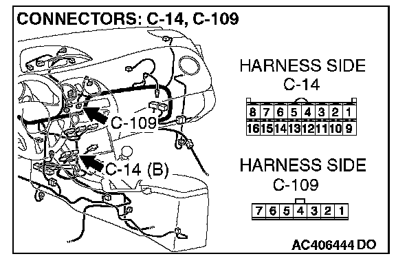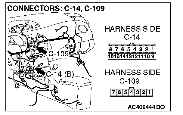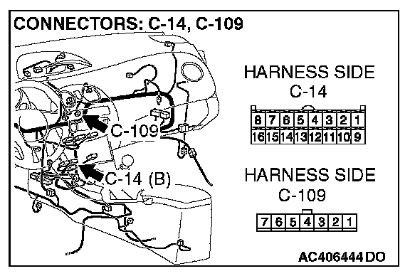STEP 7. Check the wiring harness between A/C-ECU connector C-14 (terminal 10) and air mixing damper control motor and potentiometer connector C-109 (terminal 7).