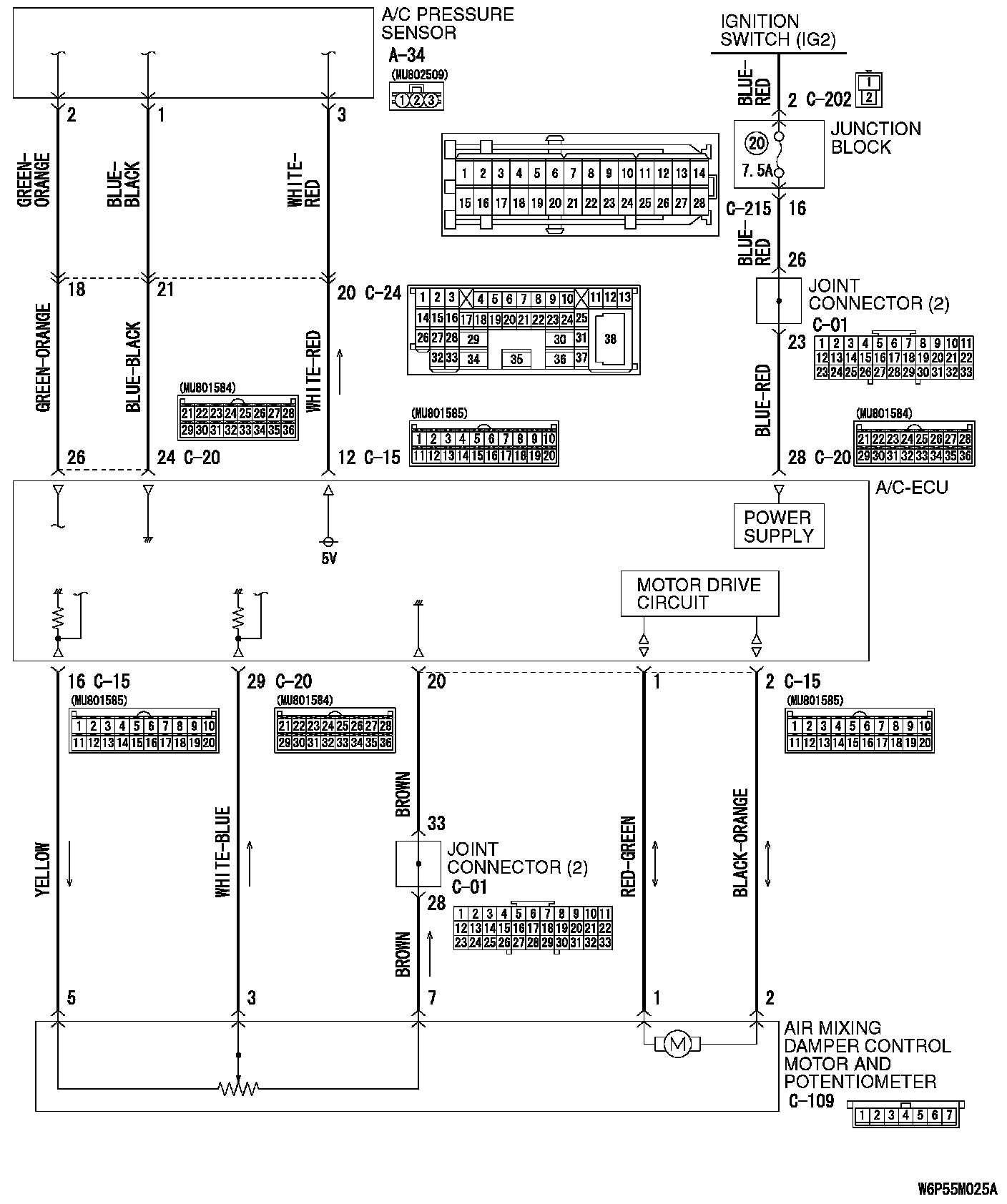 - Malfunction of the harness (open circuit, damage or short to ground of air mixing damper control motor and potentiometer circuit, short to ground of pressure sensor circuit, and open circuit or damage of power supply (IG2) circuit)