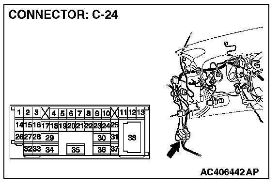 NOTE: Also check intermediate connector C-24 for loose, corroded, or damaged terminals, or terminals pushed back in the connector. If intermediate connector C-24 is damaged, repair or replace the connector as described in Harness Connector Inspection.