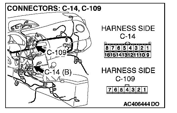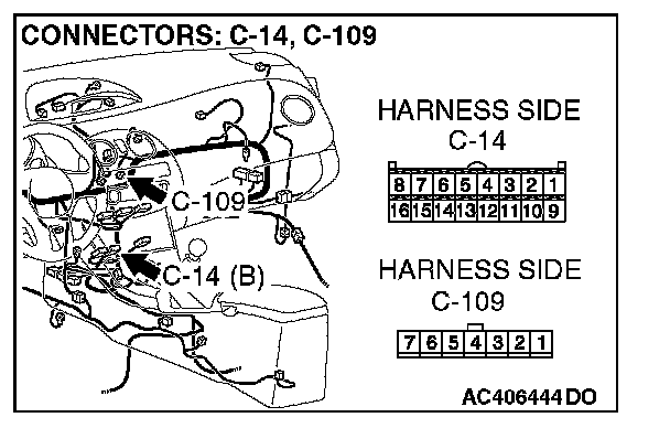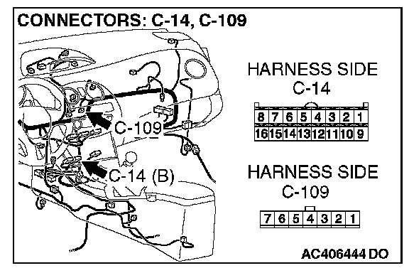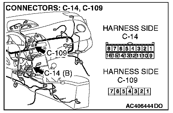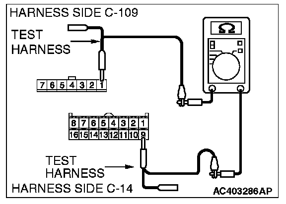 STEP 17. Check the wiring harness between A/C-ECU connector C-14 (terminal 9) and air mixing damper control motor and potentiometer connector C-109 (terminal 1).