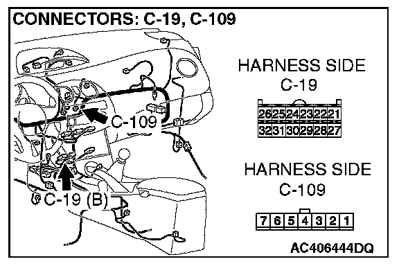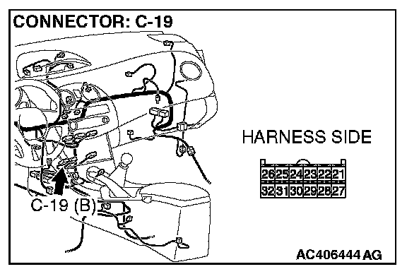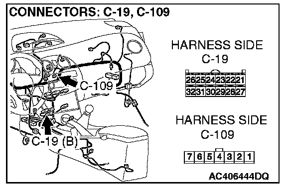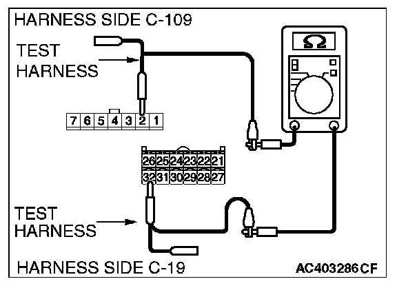 STEP 19. Check the wiring harness between A/C-ECU connector C-19 (terminal 32) and air mixing damper control motor and potentiometer connector C-109 (terminal 2).