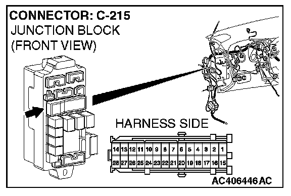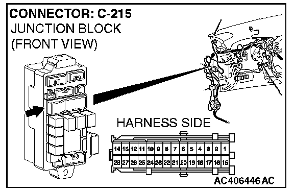 STEP 24. Check junction block connector C-215 for loose, corroded or damaged terminals, or terminals pushed back in the connector.