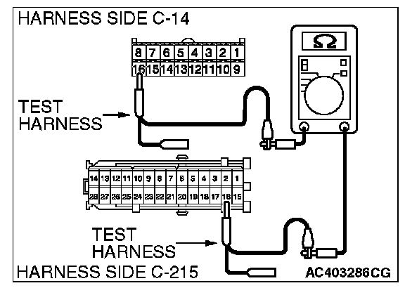 1. Disconnect A/C-ECU connector C-14 and junction block connector C-215, and measure the resistance at the wiring harness side.
